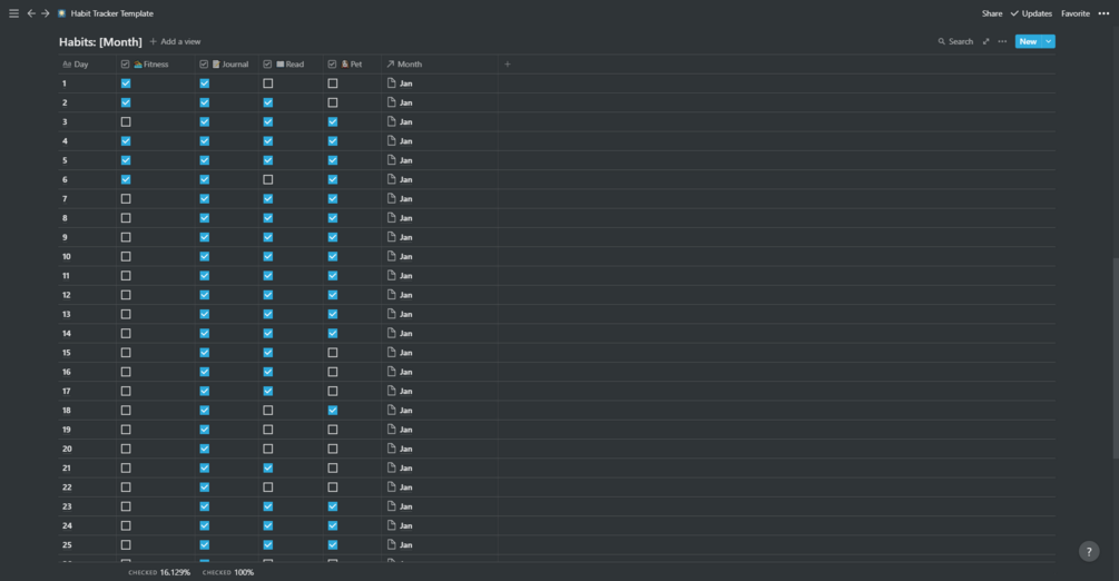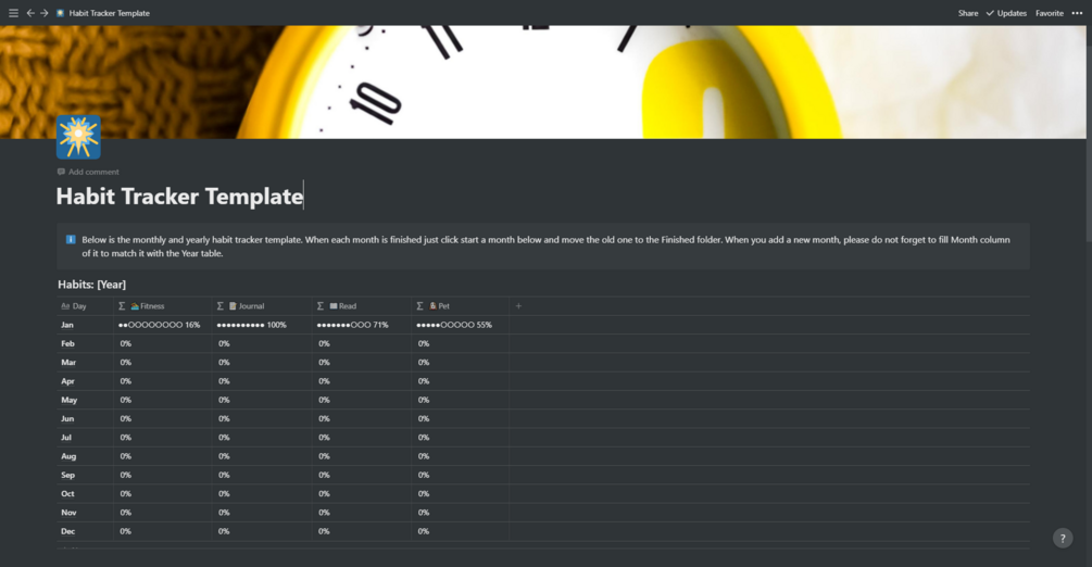 Just check the items you completed during the day and it will automatically fill the percentage bar at the corresponding month of the Yearly habit tracker table. Simple as that.